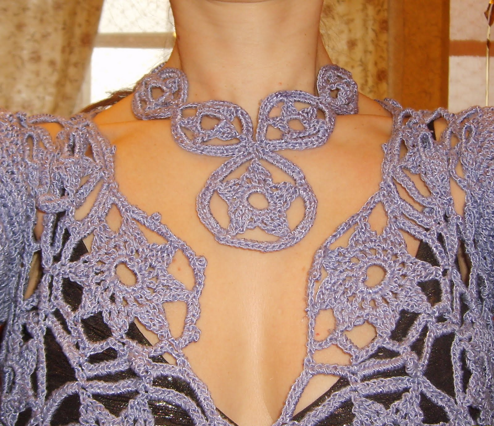 В комплект связала колье, если ввязать в него камушки сваровски/бусики/биссер, смотреться будет конечно же лучше.